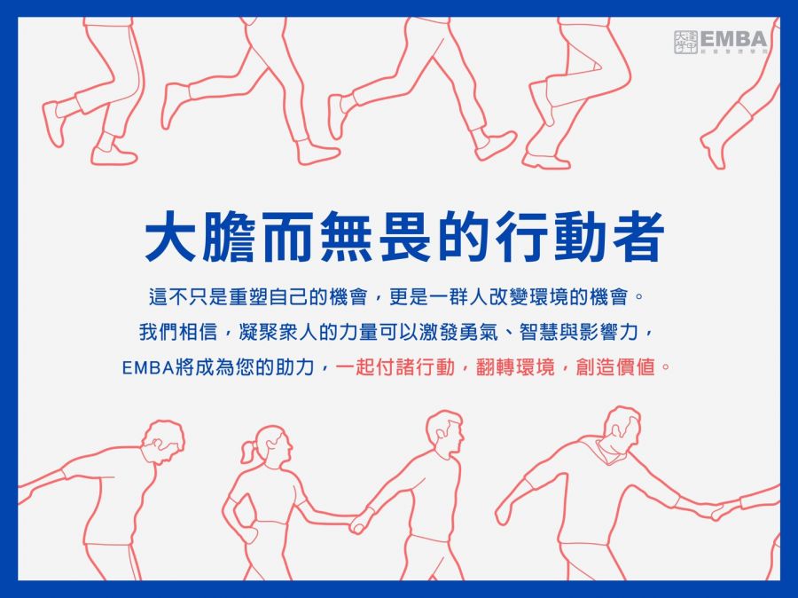 「逢甲EMBA建築產業管理組」邀請每位大膽而無畏的行動者,準備好為自己踏出那一步了嗎? 抱持著信念走,走一條自己選擇的路。